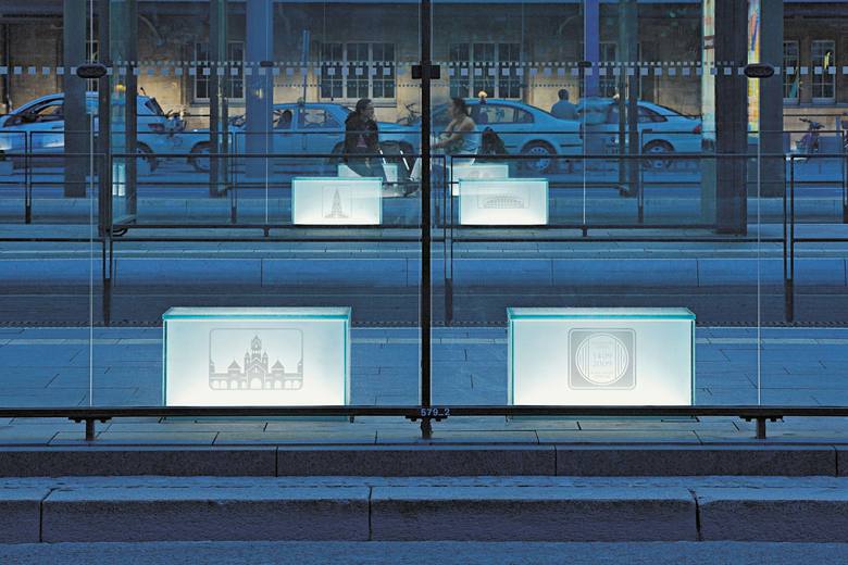 Als ein Objekt, das sich zwischen Architektur und Design bewegt, ist die Haltestelle ohne Zweifel stark von ihrer Ausstattung geprägt. Dazu gehören 8 Anzeigentafeln, 8 Fahrscheinautomaten, 2 Kioske und 47 Sitze. Die für je 2 Personen gedachten Glasblöcke sind von innen beleuchtet. An den Längsseiten stellen sie, auf das Wesentliche ihrer Gestalt beschränkt, viele Sehenswürdigkeiten der Stadt Leipzig dar, unter ihnen etwa die Thomaskirche und die Nikolaikirche, das Gewandhaus und das Schillerhaus, den Wildpark und den Zoo. Ob Bewohner oder Besucher, wer hier auf Bahn oder Bus zu warten hat, bekommt eine Einladung zur Erkundung der Stadt.