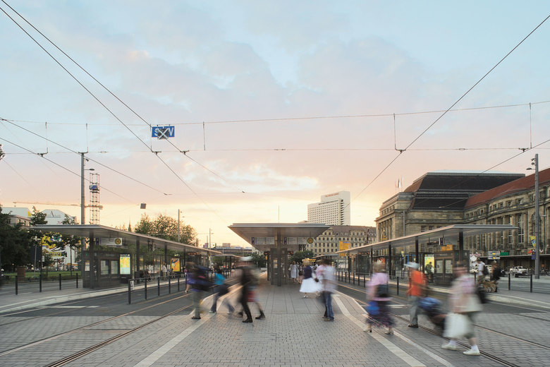 Wie in vielen deutschen Großstädten werden auch in Leipzig der Platz und die Straße gleich vor dem Hauptbahnhof von einer großen Haltestelle für Straßenbahnen und Omnibusse dominiert. An diesem Verkehrsknoten gibt es pro Werktag fast 3000 Ankünfte und Abfahrten; an diesem Verkehrsknoten steigen pro Werktag etwa 70000 Menschen ein und aus.