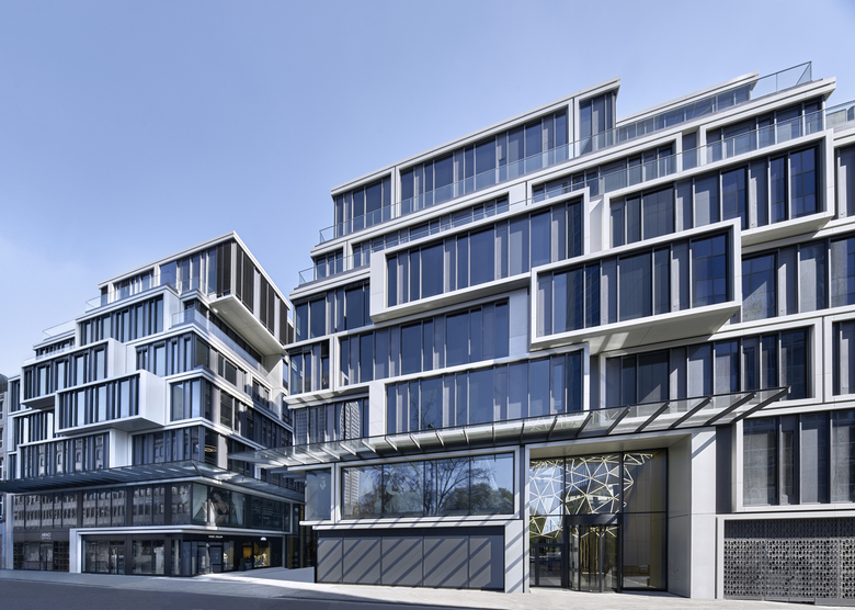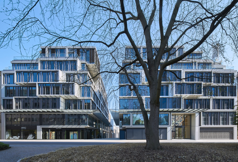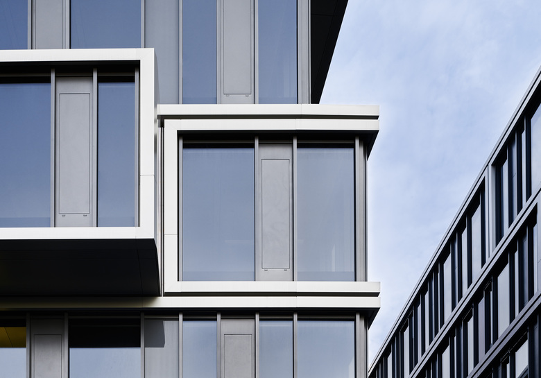 In den Obergeschossen kragen die Baukörper jeweils bis zur Straßenfluchtlinie weiter aus und treppen in den Staffelgeschossen zurück. Dadurch wird nicht nur die Neue Rothofstraße räumlich aufgeweitet, auch die beiden Baukörper erhalten so eine markante Eckausprägung.