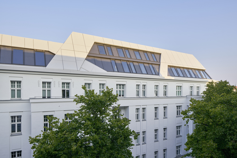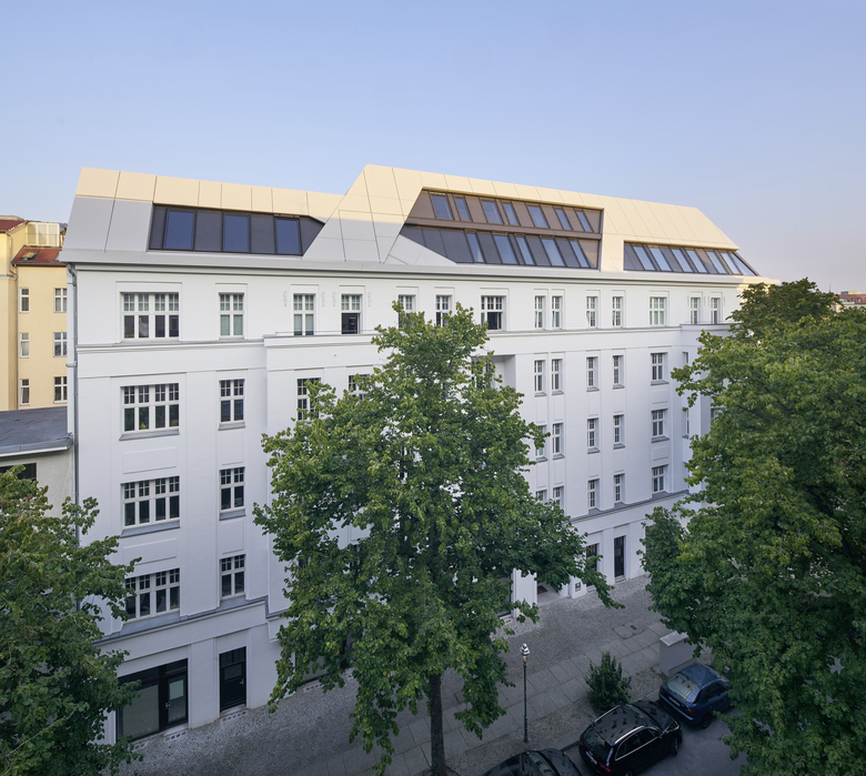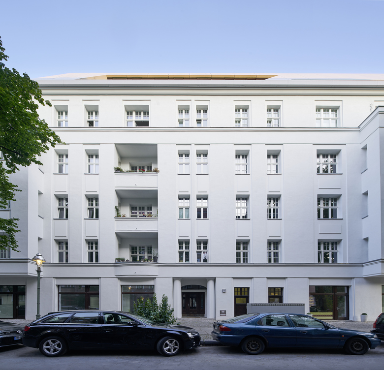 Das Bestandsgebäude Olivaer Platz 2 wurde zu Beginn des 20. Jahrhunderts als neoklassizistisches Wohn- und Geschäftshaus errichtet. Die historische - jedoch während des Krieges weitestgehend zerstörte - Dachform wurde im Volumen wiedererrichtet und die besondere Ecksituation betont. Die zeitgenössische Formensprache ist ein bewusster Gegensatz zu der vorhandenen Fassade des historischen Gebäudes. Die Dachfassade besteht aus Aluminiumpaneelen und Glasfenstern. Die weitläufige Wohnungsaufteilung mit Wohnflächen von 60 bis 600 m² wurde aktuellen Nutzeranforderungen angepasst. So entstanden im ganzen Gebäude insgesamt 20 Wohneinheiten und 7 Läden. Der Neubau liegt wie ein Schiff über den Dächern Berlins.