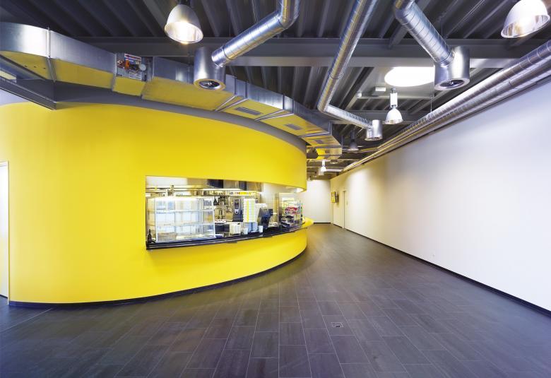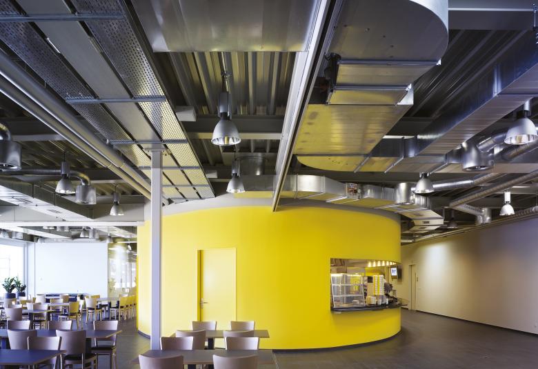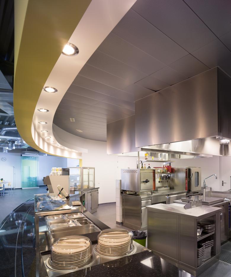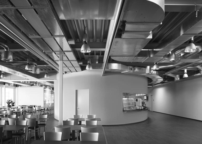 Auf dem Gelände des Produktionsgebäudes der Kaba AG in Wetzikon befand sich ein Personalrestaurant, das baulich, betrieblich und hygienisch nicht mehr den aktuellen Bedürfnissen entsprach. Es musste ein Ersatzbau entworfen werden sowie zusätzliche Schulungsräume, die unabhängig von der Produktion benutzt werden können. Durch die Aufstockung des Produktionsgebäudes direkt auf die bestehende Konstruktion wurde der existierenden Anlage die dringend benötigte, neue Identität gegeben. Es entstand ein architektonisches Merkmal, dessen Zentrum die ellipsenförmige Grossküche bildet. Die räumlich klare Gliederung und Grundrissorganisation ermöglichen im Innern eine grosse Nutzungsvielfalt, die mit der markanten Erschliessung sowohl intern als auch extern benützt werden kann. Das bestehende Stützenraster des Produktionsgebäudes wurde übernommen. Der Erschliessungskern und Teile der Aussenwände wurden in Massivbauweise betoniert, die Leichtbauwände können flexibel positioniert werden. Das Dach wurde als Stahlkonstruktion ausgebildet und mit vorfabrizierten Betonplatten eingedeckt.