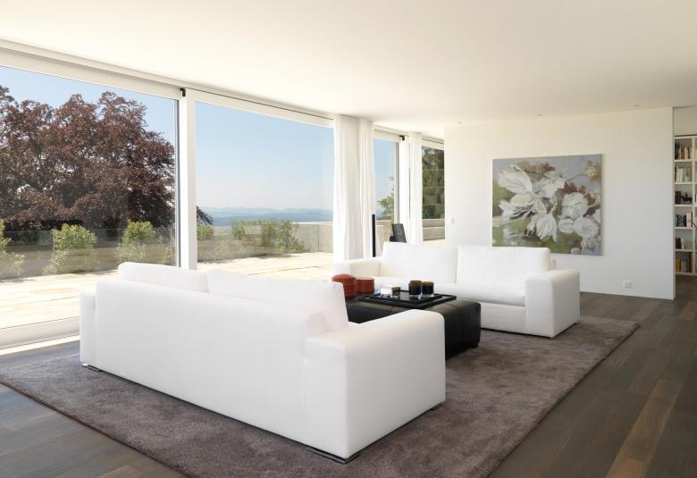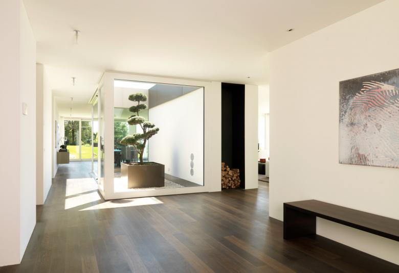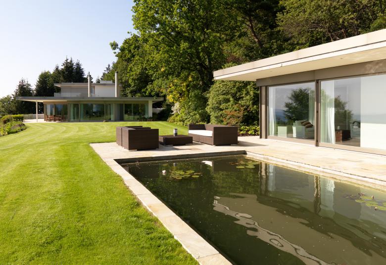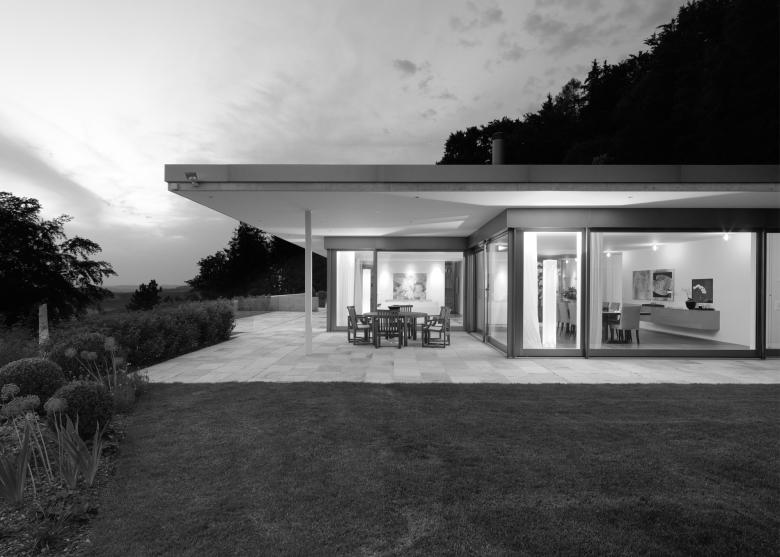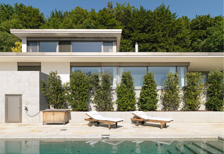 Charakteristisch für das rund 22‘000 m2 grosse Grundstück ist auf der vorderen Seite die einzigartige Weitsicht auf der rückwertigen Seite der Wald. Auf der abgeschiedenen Parzelle wurde ein Wohnhaus gestaltet, das durch eine Reihe existierender, verschieden angeordneter Mauern begrenzt war. Diese bildeten zusammen mit weiteren, neuen, präzise platzierten Mauern, beziehungsweise Schichten das Entwurfsthema. Es entstanden spannungsreiche Räume, bei denen innen und aussen zu verschmelzen erscheinen. Der Grundriss ist in klar definierte Schichten aufgebaut. So ist das Wohnzimmer mit dem TV-Raum, dem Esszimmer sowie den beiden Kinderschlafzimmern nach vorne beziehungsweise zur Seite hin orientiert. Die übergrosse Wohnküche, die Hauswirtschaft und das Büro sowie der Aufenthaltsraum der Kinder sind nach hinten gelegt. Grosse Fensterflächen in diesem hinteren Bereich ermöglichen eine ungehinderte Sicht an die wunderschön überwachsene Mauer. Zwischen den beiden Bereichen befindet sich der Eingang mit den Treppen, die nach unten beziehungsweise nach oben führen. Auffallend ist der üppige, fantastisch angelegte Garten mit teilweise altem Baumbestand und dem neuen Gartenpavillon, der zudem als Gästetrakt genutzt wird.