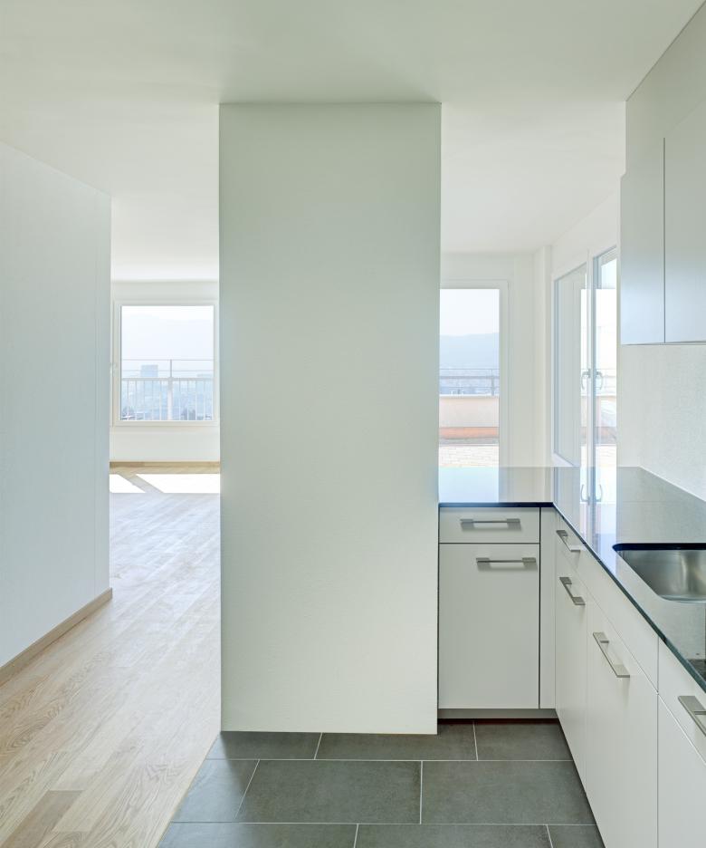 Das Mehrfamilienhaus an der Bergellerstrasse wurde 1967 durch einen privaten Eigentümer erstellt und im Jahr 2017, also 50 Jahre später, verkauft. Die Liegenschaft bestand aus zehn Geschosswohnungen mit 2 ½, 3 ½ und 4 ½ Zimmern und einer übergrossen 6 ½ Zimmer Attikawohnung. Da die Einheiten im Laufe der Zeit nie instand gestellt wurden, zeigten sie vor allem in der grundrisslichen Disposition und in der Haustechnik einen aufgestauten Unterhaltsbedarf. Ein Ersatzneubau stand jedoch nicht zur Diskussion. Deshalb wurde das Gebäude saniert und zudem das Ausbaupotential in der Attika ausgeschöpft. In den unterschiedlich gestalteten Geschosswohnungen wurden die Küchen in der Anordnung angepasst, die Badezimmer vollständig ersetzt und sämtliche Oberflächen aufgefrischt. Die Attika wurde maximal verlängert und weiter mit beidseitigen Dachgauben ergänzt. Dies erlaubte eine neue Gliederung in zwei 3 ½ Zimmer- und einer 2 ½ Zimmerwohnung mit umlaufender, grosszügiger Dachterrasse und präzisen Ausblicken, was nicht nur eine Verbesserung des Wohnungsschlüssels zur Folge hatte, sondern insbesondere eine wünschenswerte Wertsteigerung.