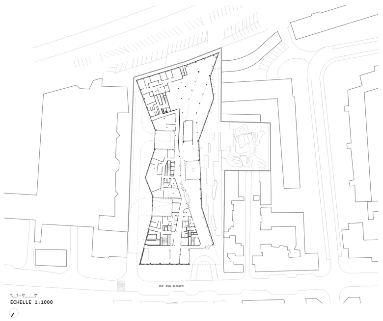 The complexity of the site called first of all for a detailed constructibility review. All constraints were modeled on the current PLU (plan local d’urbanisme – local urban development plan) – building heights, street alignments, distances from buildings on neighboring plots – in order to obtain the greatest possible constructible volume. From this potential form, an initial model was developed, enabling us to define the various design options possible under the current regulations, as well as possible adaptations that could be envisaged in the event of the PLU being revised.