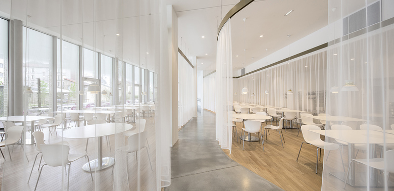 The core zone that concentrates the bulk of user flows forms the center of gravity of this fluid space, linking it directly with the cafeteria and restaurant, which look out on to the papyrus garden, a unique landscape in the Paris region and an open-air extension of the ground floor in the summer months. This garden, with its curtains of vegetation, not only forms a remarkable landscape but also creates a certain distance from the surrounding environment. While private, the garden is hinted at from the street, and accompanies the visitor from the esplanade through to the entrance hall. It creates a memorable image for outside visitors and the building’s occupants alike.