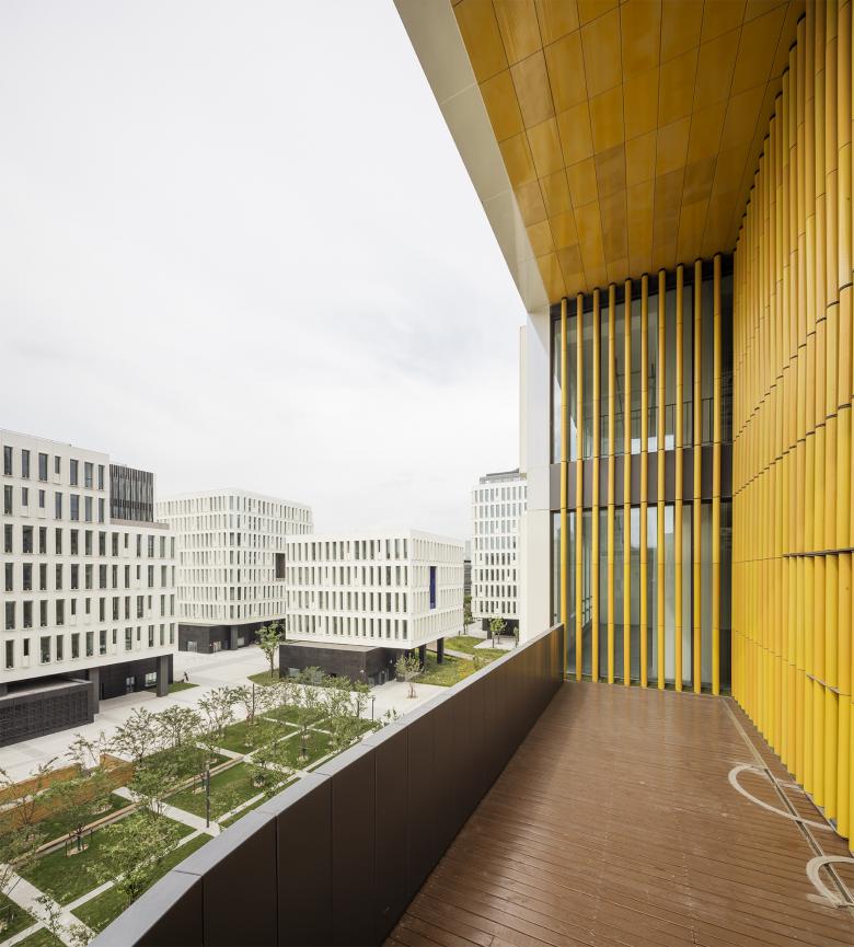 The architecture is sober and unitary, bringing a calm counterpoint in a Shanghai in constant movement. The numerous loggias are identified by the use of colored ceramic tubes, a contemporary evocation of bamboo using ancestral Chinese know-how. The interplay of colors and materials creates a sense of movement, and a constantly shifting façade viewed differently from various standpoints.