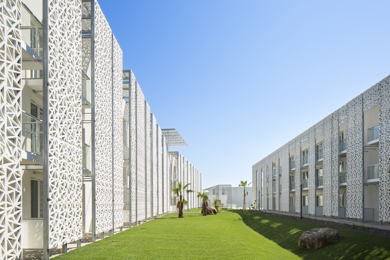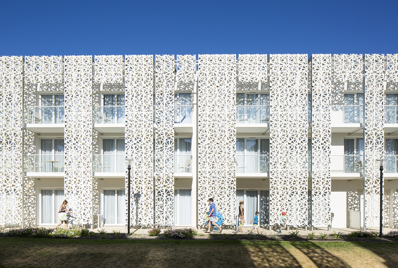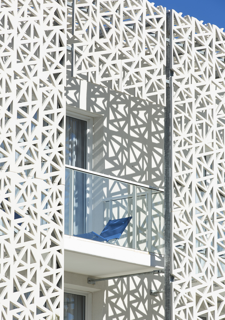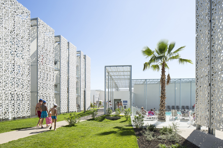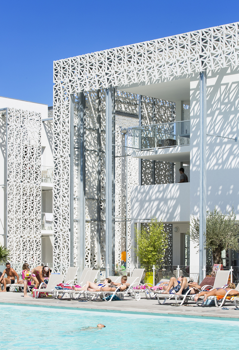 Large white trellises provide depth to the facade and trap light and shade in a continuous kinetic effect. They create a vibrant background for the joyful ballet of holidaymakers' silhouettes, and are illuminated at night to create a soft, subtle ambiance.