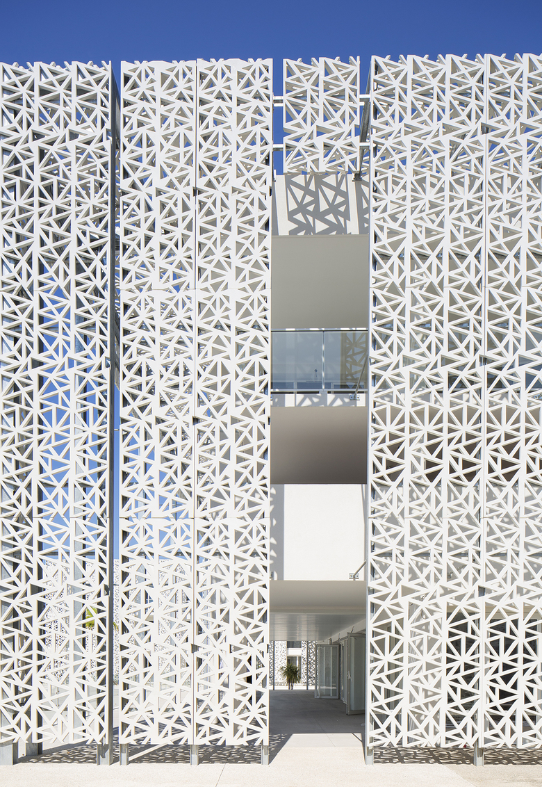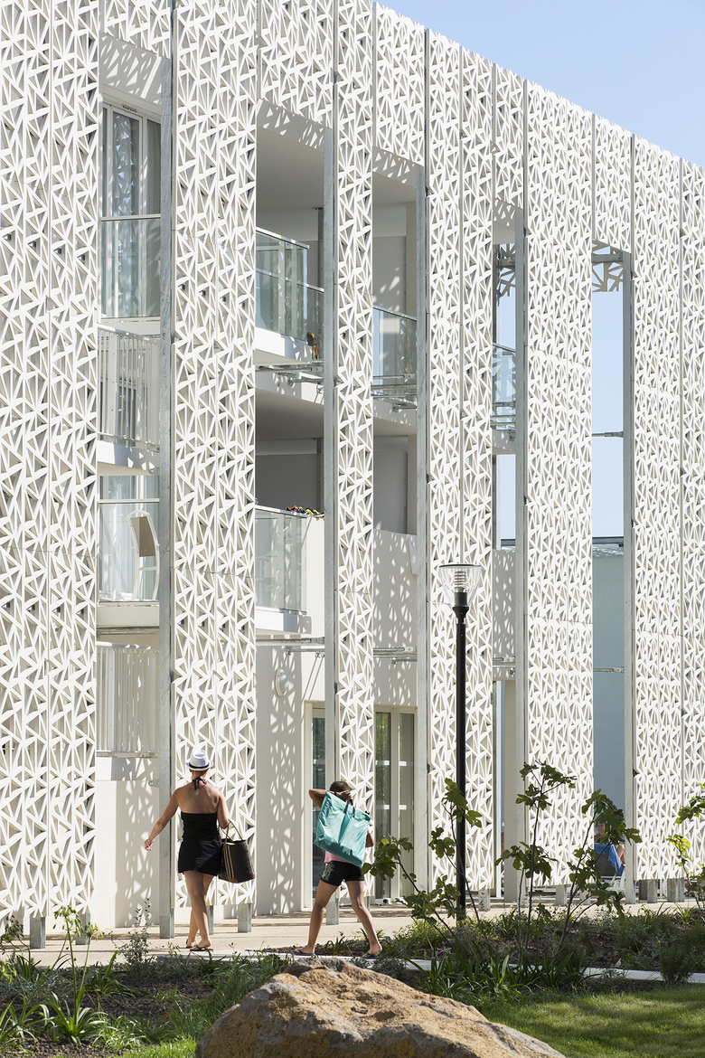 Large openwork walls in white concrete cohesively punctuate the various developments. They function as filters, putting distance between the shared areas – gardens and swimming pool terraces - and the more intimate room area. The dual facade system creates an in-between space, an extra space that is neither part of the building’s interior nor its outside areas. The balconies project into this ambiguous space and give a feeling of being simultaneously inside and outside.