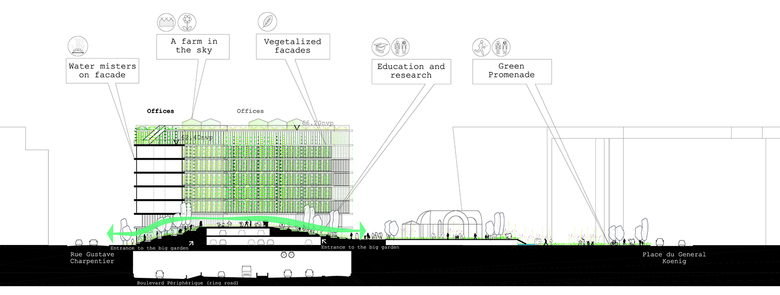 The ring road is crossed by the landscape-bridge, an inhabited structure where the covered markets, shops, a school of urban horticulture, and a coworking space are located. It is covered by a garden accessible to the public, with openings all round onto the public space.