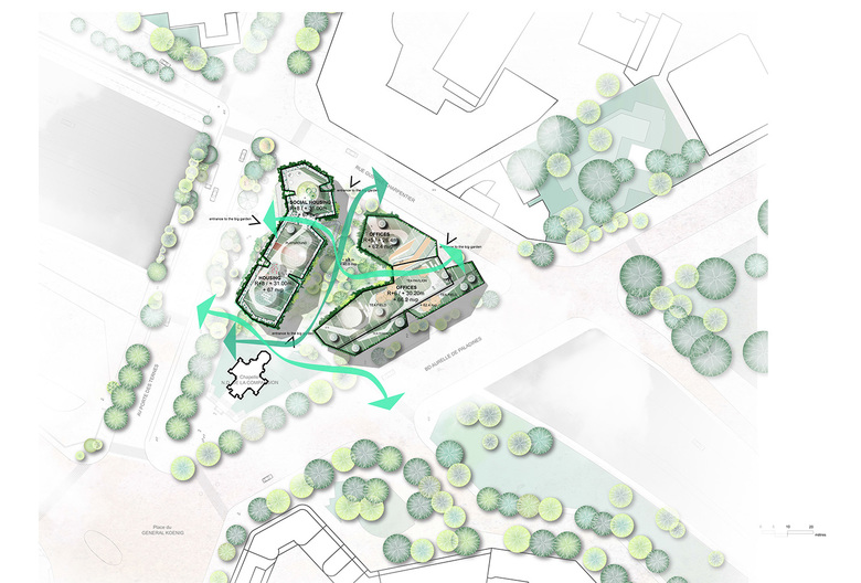 The Porte des Ternes is welcoming a building that is one-of-a-kind yet respectful of its context, and one that reconnects with the Parisian scale. This generous and open project is designed to enhance the experience of local inhabitanbts. Here, the ring road becomes a landscaped plaza of Grand Paris (Greater Paris), a public prototype for a new landscape for the Parisian metropolis.