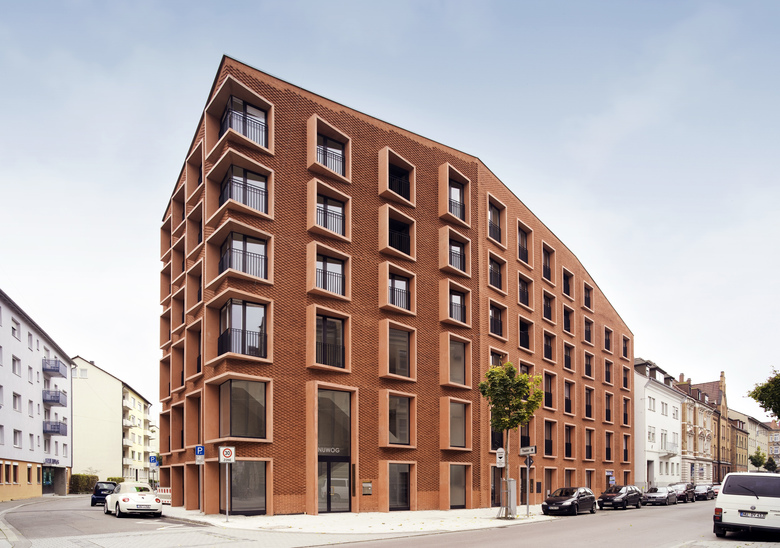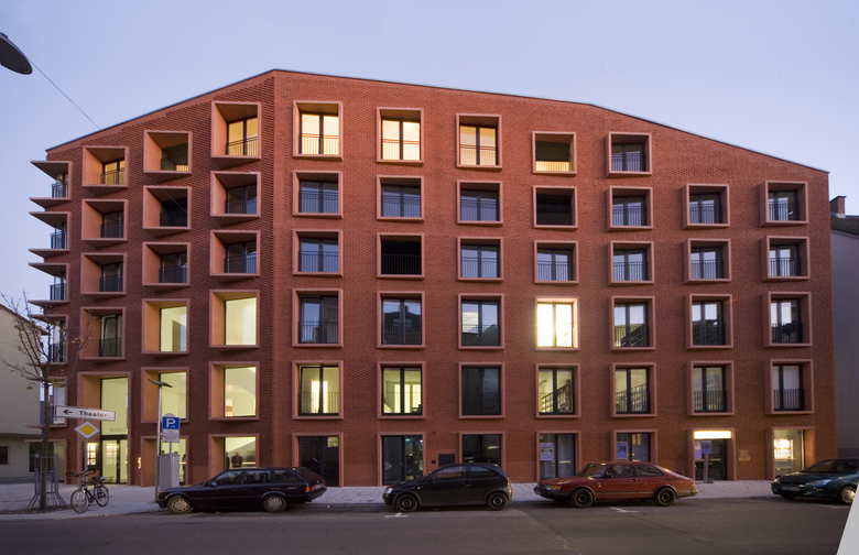 Form und Ausdruck des Stadthauses suchen nach Eigenständigkeit und zugleich nach Kooperation mit der Stadt, die sich Mitte des 19. Jahrhunderts rasterförmig innerhalb der 1841 gegründeten Bundesfestung entwickelt hat. Die primäre Gestalt des Hauses reklamiert in seiner Formfindung Autarkie und eine neue Dimension für die kommende Entwicklung der Stadt. Die Form der dünnformatigen, eigens hergestellten Torfbrandklinker und der gleich gefärbten Beton-Fensterrahmen nehmen die Geometrie des orthogonalen Rasters auf. Einheitliche Fassadenöffnungen geben den Wohnungen durch außergewöhnlich viel Licht einen hohen Alltagswert und schaffen in der äußeren Erscheinung einen Maßstab, der eine hohe Wiedererkennbarkeit herstellt. Das Ziel, die Grenzwerte des Niedrigenergiehaus Standards zu unterschreiten, wird durch ein sehr günstiges Volumen-Hüllflächen-Verhältnis, die Minimierung von Transmissionswärmeverlusten durch hochwärmegedämmte Außenbauteile, durch die Bauteilaktivierung der Massivdecken und durch eine Pelletheizung erreicht.