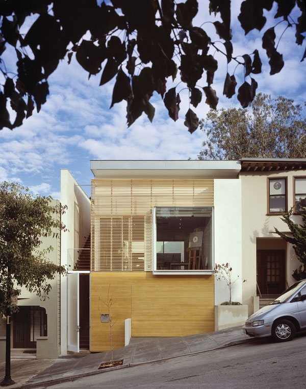 This new house in San Francisco includes a small front building with a garage on grade and a painting studio above and a three-story 2500 sq ft. house in the back with a courtyard between the two.