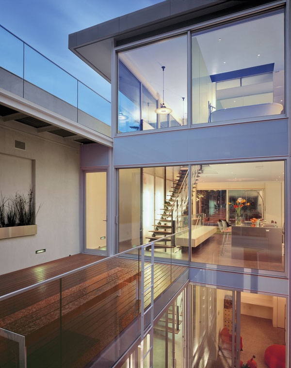 Natural Daylight. Floor-to-ceiling glazing that faces the courtyard spaces allows for a light filled interior protected from excessive solar gain. The louvered street façade allows ample glazing behind while protecting the resident's privacy. The result throughout the home is generous ample daylight that reduces the need for artificial lighting and raises the