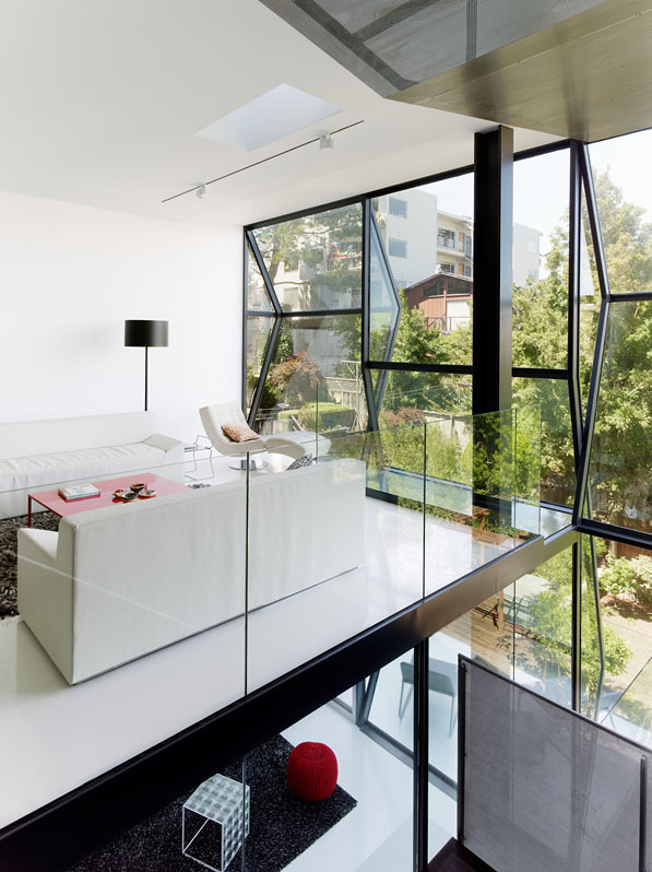 Like many San Francisco homes, this one poorly integrated its many levels with each other and with its sloping topography and solar orientation. Reversing its reading, we recast the back of the house as its primary façade with a faceted, custom-built glass wall. Divided into three vertical panels that push in and out, this dynamic prism brings animating light and spectacular views to the communal living spaces, now placed at the rear. Bedrooms were flipped to the front.