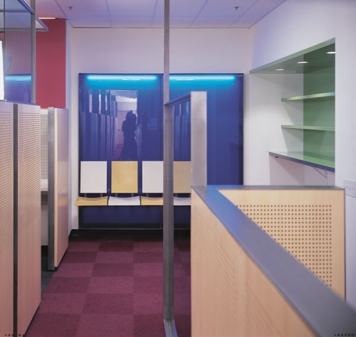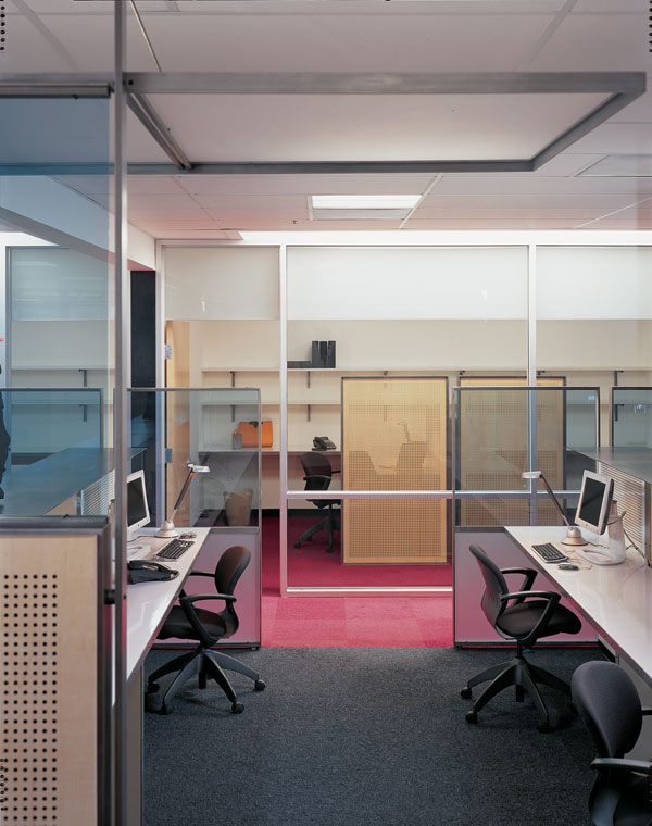 The finely detailed and crafted workstations are clad in perforated wood partitions, colored glass and acoustical batting. Made of steel in standard sizes and shapes, the workstations are assembled simply to maximize lightness and efficiency. Overhead canopies further visual interest, breaking up the plane of the T-bar ceiling.