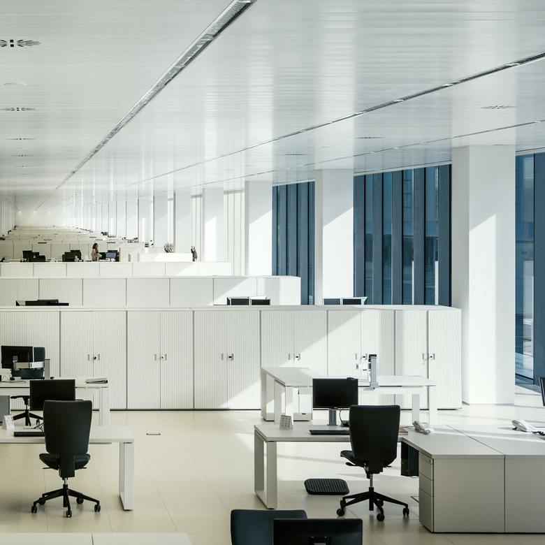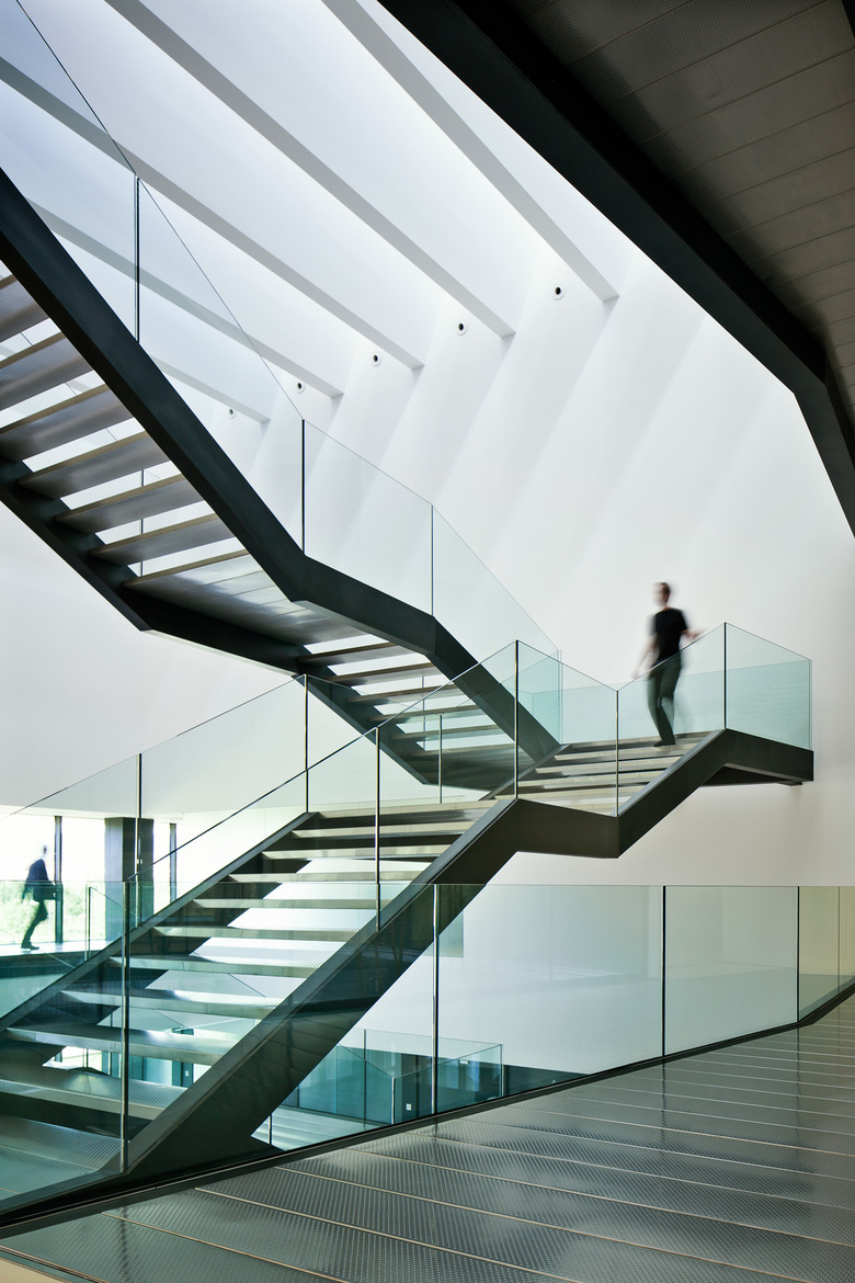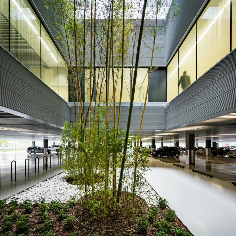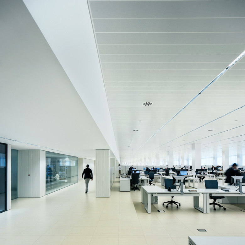 The new Massimo Dutti office of the INDITEX Group has a rectangular floor plan, 220 metres long and 62 wide, completing its geometry with two rounded corners and generating three opaque façades with a few openings, and a completely glazed north-facing façade. The ground floor is a large outdoor entrance space that is open but sheltered, and floors one and two are laid out in the form of a lengthwise strip of service spaces, grouping together vertical communication shafts. Three courtyards provide natural light to spaces that need it, such as offices or meeting rooms. The north strip is an open-plan space, 35 metres wide and 220 long, for product design and development. The south-facing strip situates the building’s main communication nucleus at its centre, optimizing layouts. This nucleus consists of a triple-height foyer with open stairways and lifts. The space receives daylight through a large south-facing opening on the ground floor and a skylight in the roof floor. The rest of the southern strip lays out parts of the brief that need partitioning, such as visiting rooms, showrooms, a pilot shop, e-commerce, etc.