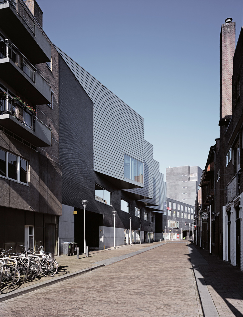Pieter Vreedeplein is an extensive urban renewal project in the centre of the city of Tilburg, in the Netherlands. It involves the construction of 125 dwellings, 30,000 m2 of commercial premises, seven cinemas, an underground car park with 900 parking spaces and the definition of a new public space. This complex building is the product of the complexities of its location, brief, diversity of volumes and different alignments. To create a unitary image, we used just one material, clinker brick, throughout.