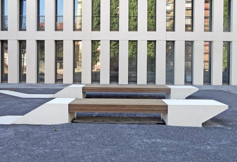 Der rückseitig des Neubaus liegende Freiraum wird durch den terrassierten Gartenhof geprägt. Durch die im Untergeschoss liegende Nutzung als Veranstaltungs- und Sozialraum vorgegeben, wird der Gartenhof als grüne Erweiterung des Gebäudes angelegt. Seitlich durch zwei geschosshohe Ortbetonwände mit davorliegenden Stufen- und Wegeanlagen gefasst, terrassiert sich der Freiraum in ca. 50 cm hohen Stufen auf die Höhe des 1. Untergeschoss herab. Am Gebäude bietet eine Terrassenfläche aus großformatigen Betonplatten die Möglichkeit zum Aufenthalt im Freien. Die Grünen Terrassen werden als Rasenflächen und in Teilbereichen als Pflanzflächen mit Gräser- und Staudenpflanzung angelegt und von mehrstämmigen Kirschen überstanden.