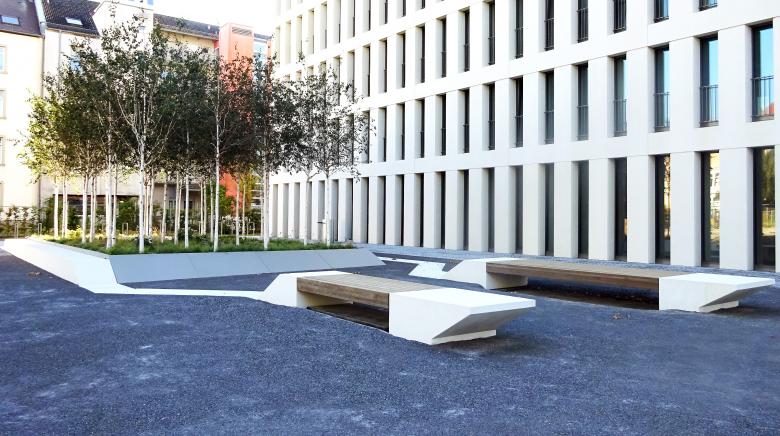 Die Freianlagen des Neubaus des Finanzamtes Karlsruhe Stadt gliedern sich in zwei Teilbereiche: Vor dem Neubau befindet sich der Vorplatz mit Zugangssituation, hinter dem Gebäude liegt der terrassierte Gartenhof.