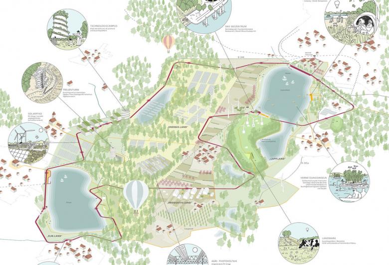 Der Technologiecampus entwickelt bestehende Infrastruktur weiter und bietet einen städtebaulichen Rahmen für die wirtschaftliche Entwicklung. Im Elmland und im Lappland sieht der Entwurf zahlreiche Angebote zur landschaftsbezogenen Erholung vor. Der Entwicklung des Elmsees wird als Sukzessionsprozess gestaltet und etwa über Aussichtstationen erlebbar gemacht. Die ehemalige innerdeutsche Grenze wird durch Vernetzungsinseln im Lappwaldsee erlebbar. […]“
