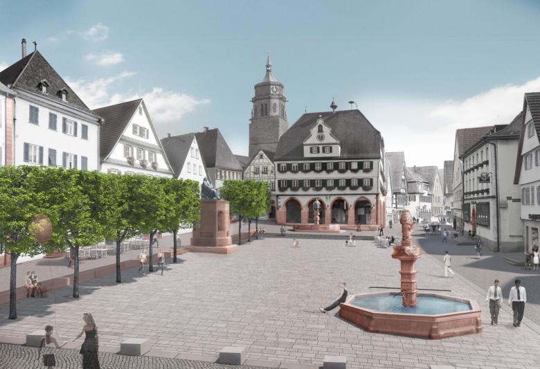 Ein neuer, steinerner Platzteppich prägt den neuen Marktplatz in der historischen Stadtmitte von Weil der Stadt. Die nördliche und östliche Platzkante des steinernen Inlays wird gefasst mit einer kombinierten Sitz- und Stufenanlage, die die Bestandstopografie aufgreift und das historische Kepler-Denkmal an der nördlichen Platzkante zentral integriert. Neben dem Kepler-Denkmal werden die beiden historischen Brunnen als prägnante Objekte auf dem Platzteppich des Marktplatzes herausgearbeitet. Der Marktplatz wird zukünftig im Wesentlichen von Parkierung und Befahrung freigehalten.