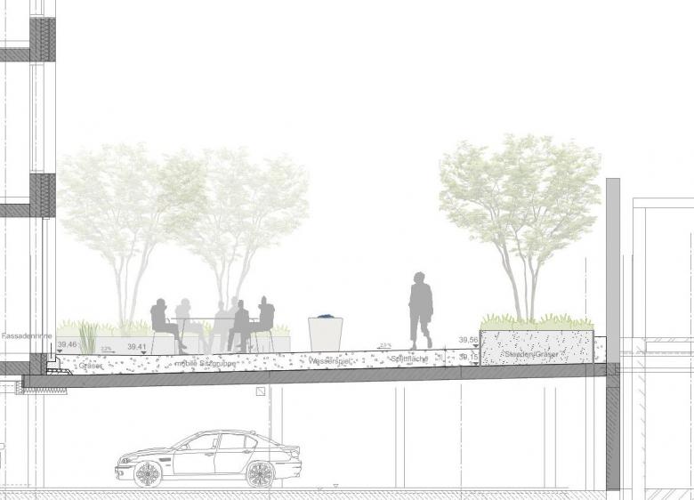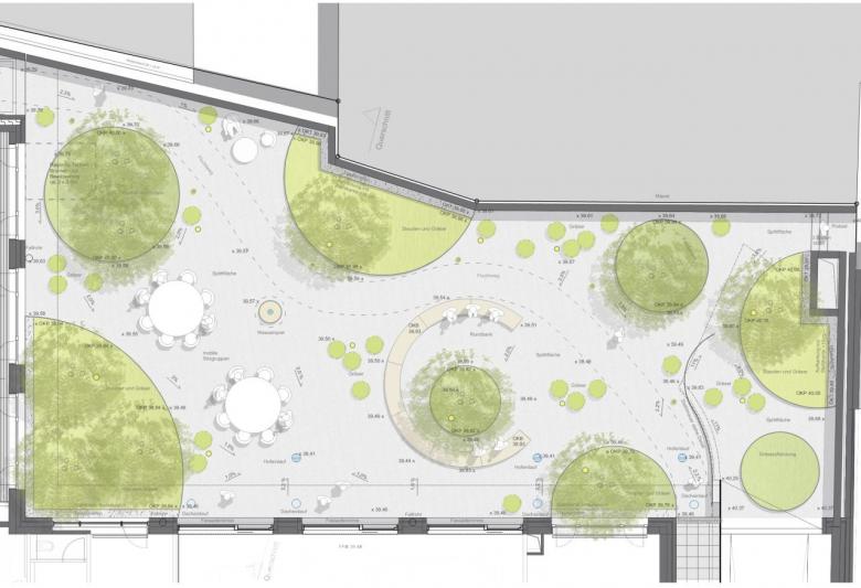 Der Hof wurde mit kreisrunden aufgekanteten Pflanzflächen, in denen Stauden und Gräser zu finden sind, gestaltet. Die 30-40 cm hohen Pflanzflächen werden durch lackierte Stahlkanten umgrenzt. Ein kleiner Brunnen ist als besonderer Blickfang und atmosphärisches Element platziert. Eine großzügige Sitzbank aus Muschelkalk bildet den zentralen Punkt im Garten und dient als Treffpunkt. Die Pflanzung von mehrstämmigen Koelreuteria paniculata (Blasenbaum) in den Pflanzflächen und den locker verteilten Gräsern in der wassergebundenen Wegedecke setzen besondere Akzente.