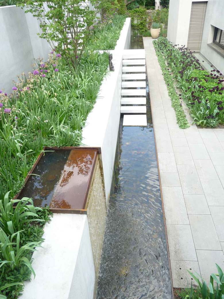 Der an einem steilen Hangrundstück im Stuttgarter Westen entstandene Garten verbindet sich konsequent mit der Architektur des neuen Wohnhauses. Die Gestaltung des Gartens bezieht sich auf die vorgefundene topografische Situation mit einem Höhenunterschied von 12 Metern von der unteren Zugangsebene bis zur oberen Grundstücksgrenze. Stützmauern aus Beton und Naturstein terrassieren das Gelände und entwickeln unterschiedliche Niveaus mit quer zum Hang liegenden Terrassen. Drei Gartenebenen und zwei Gartenterrassen spannen über die gesamte Grundstücksbreite und gliedern den Garten. Reduziert gestaltet Treppenläufe erschließen die unterschiedlichen Ebenen von Haus und Garten. Das Gartengeschoss mit zwei gliedernden Rasenflächen und dem Pool als Abschluss befindet sich auf der Erdgeschossebene des Wohnhauses und inszeniert den weiten Ausblick über die Stadt. Im oberen Gartenteil befindet sich das 23 m lange Wasserbecken mit zwei weiteren Gartenterrassen und einem über Steckstufen erschlossenen Sitzplatz auf dem obersten Gartenniveau.