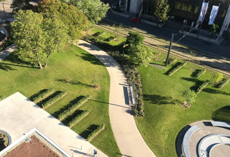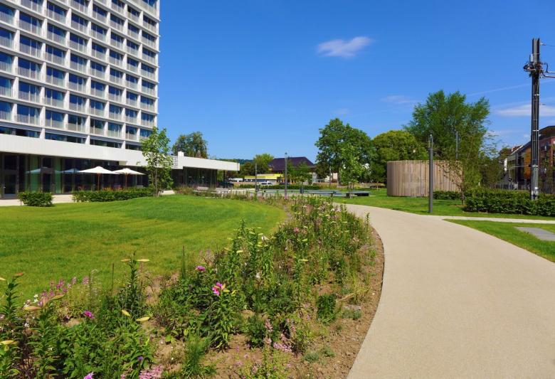 Heilbronn erhält einen anspruchsvoll und angemessen umgestalteten Stadtgarten. Durch den Hotelneubau und die Sanierung der Bestandstiefgarage in Mitleidenschaft gezogene Grünflächen werden mit gärtnerischen Mitteln und dem Ziel einer hohen Freiraumqualität wiederhergestellt und im Bereich des Busbahnhofes an der Karlstraße wesentlich ergänzt.