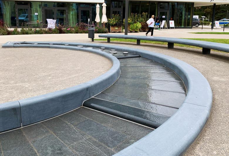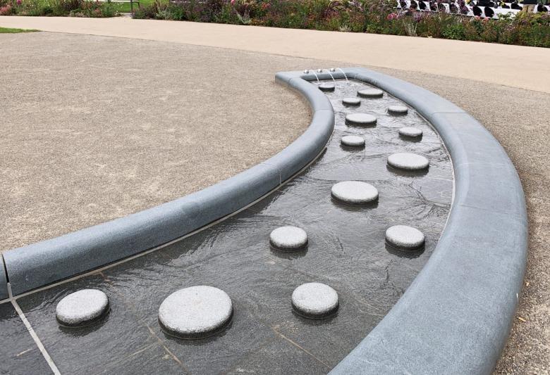 Der Wandelweg führt an angelagerten Aufenthaltspunkten mit unterschiedlichen Nutzungen durch den Stadtgarten. Diese Orte sind als Kreise geformt und werden von schwebenden Rundbänken mit Granitsteinauflage eingefasst. Der südliche Punkt erhält einen Wasserlauf, welcher zum Spielen einlädt.