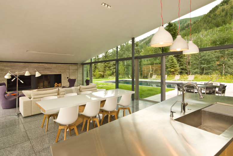 This 2,850 SF guest house in the Rocky Mountains integrates into and accentuates its mountain environment. Two intersecting bar shapes bookend to complete the implied courtyard of the original house, creating a high mountain yard that connects the two structures into a single family gathering place. Planes of ‘roof meadow’ render the house practically invisible from the road, and sculpt a private sunken court. Continuous clerestory glass focuses the panorama views and provides a completely day-lit space. A thick solar wall separates the service side of the building from the main courtyard while creating a secondary space for cars, storage, and the harvesting of solar energy.