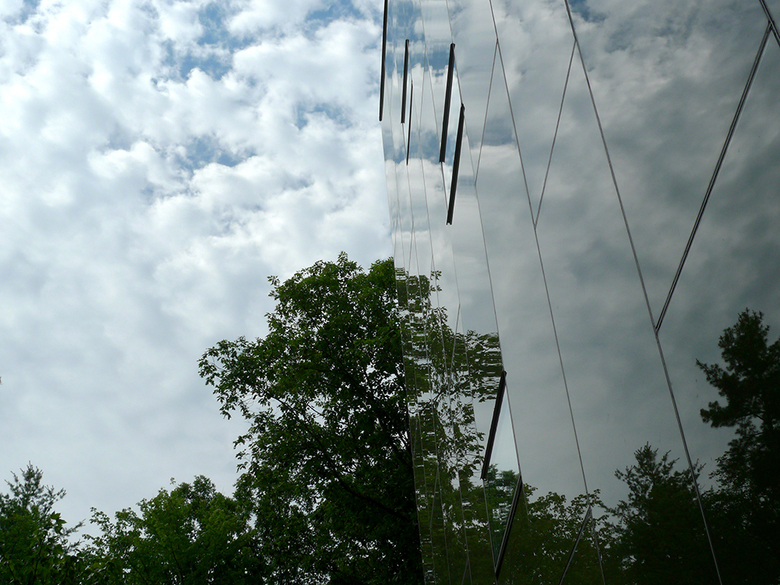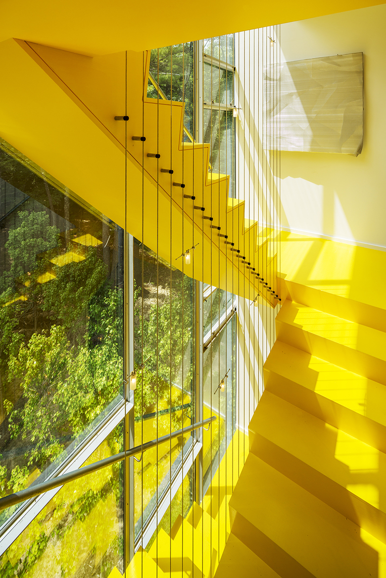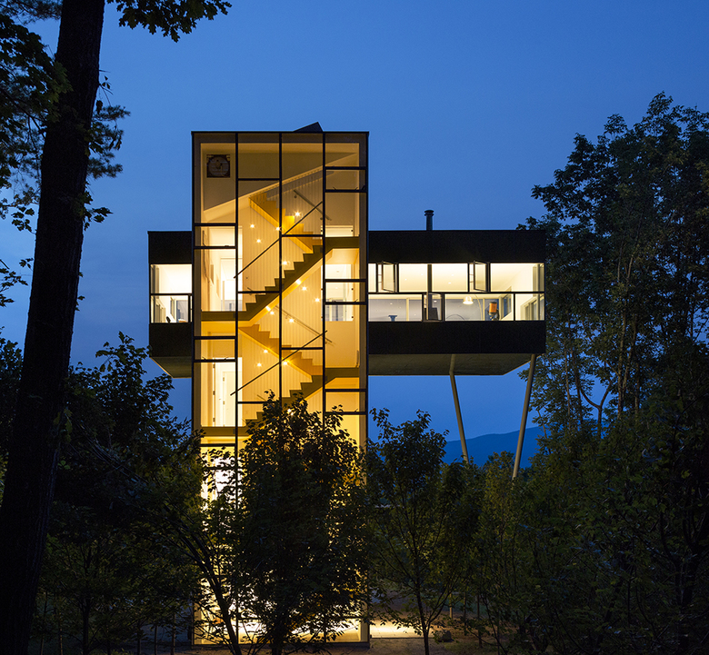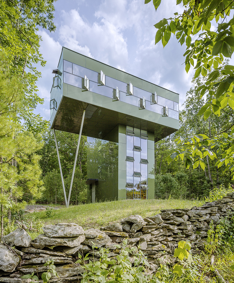 The top floor, which contains the living spaces, spreads out from the tower like the surrounding forest canopy, providing views of the lake and mountains in the distance, virtually the entire Catskill mountain range. An outdoor roof terrace deck above extends the living space above the treetops, offering a stunning lookout to the deep view. The glass-enclosed stair also highlights the procession from forest floor to treetop aerie. At dusk, mini lights dotting the cable rail of the stair mimic local fireflies sparkling in the woods as day turns to dark. The dark green, back-painted glass exterior camouflages the house by reflecting the surrounding woods, de-materializing its form.