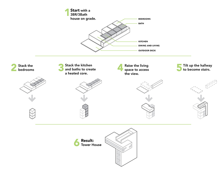 This small vacation house is designed as a stairway to the treetops. Keeping the footprint to a minimum so as not to disturb the wooded site, each of the first three floors has only one small bedroom and bath, each a tiny private suite.
