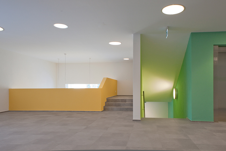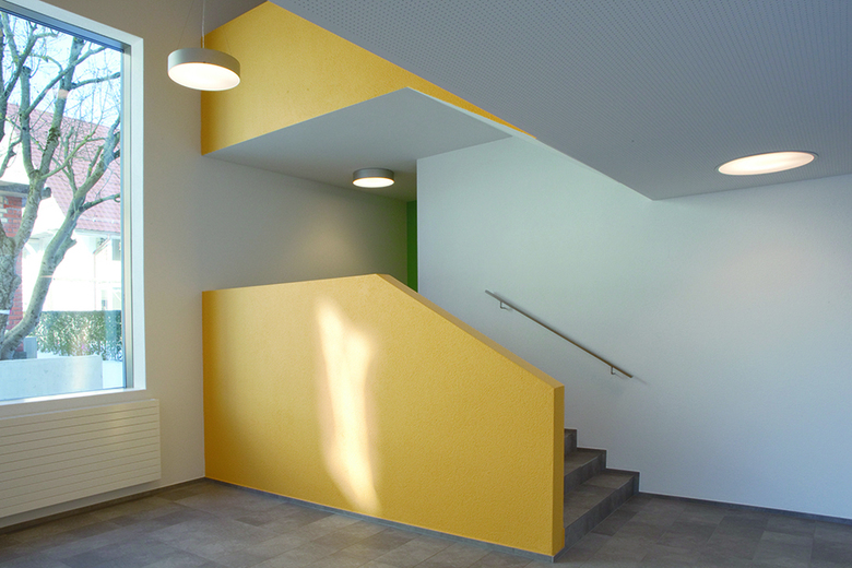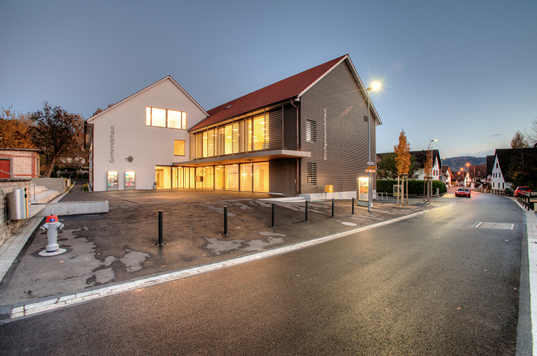 Das Projekt basiert auf einem Wettbewerbsentwurf aus dem Jahr 2004 und gliedert sich in zwei, mit Giebeldächern versehene Baukuben, die teilweise ineinandergeschoben und in einem offenen Winkel leicht gegeneinander versetzt sind gegen Westen öffnet sich die Überbauung auf einen kleinen Dorfplatz, der gegen Norden durch das klassizistisch geprägte ehemalige Schulhaus abgeschlossen wird. Der zurückgesetzte Gebäudeteil übernimmt die Räumlichkeiten für die Gemeindeverwaltung, die sich über die drei Geschosse verteilen. Der an die Strasse anschliessende Gebäudeflügel war ursprünglich für einen Lebensmittelladen mit Wohnungen in den Obergeschossen vorgesehen. Nun kann die reformierte Kirchgemeinde an dieser Stelle einen Gemeindesaal mit Office und drei Mehrzweck - und Sitzungsräumen realisieren. Die kubische Erscheinung gliedert die Bauten harmonisch in den bestehenden Dorfkern ein, die Detaillierung kennzeichnet sie jedoch als zeitgenössisches Gebäude.