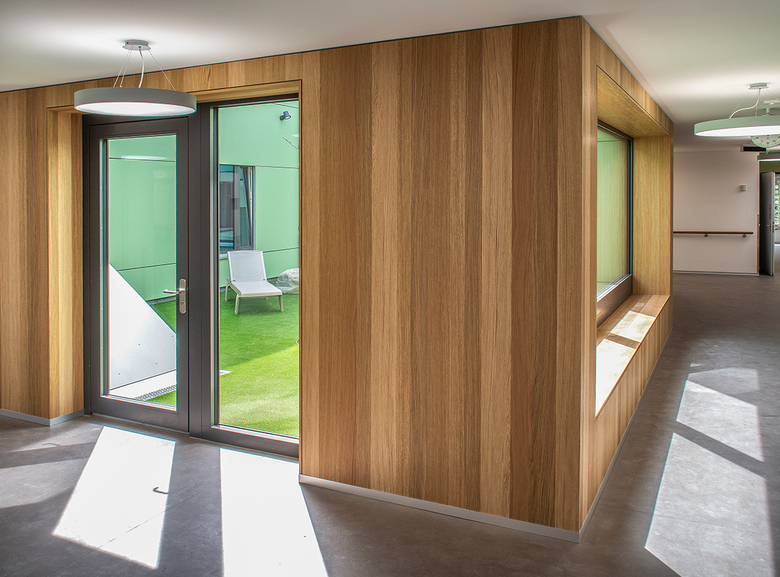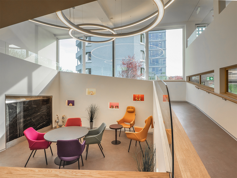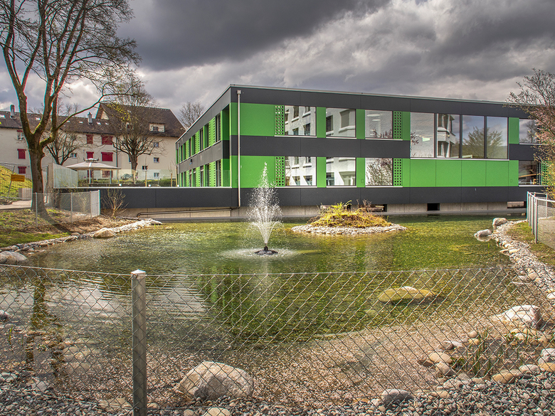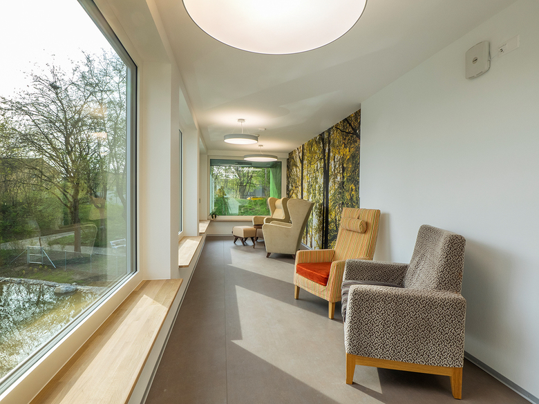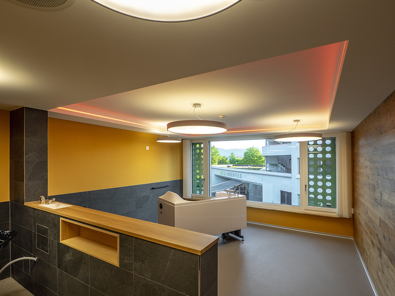 Das Haus am Teich ist eine geschützte Abteilung des Lindenfeld, geplant als Haus für mobile, weglaufgefährdete, demente Bewohner und Bewohnerinnen. Das Haus soll in sich als kleines Dorf funktionieren, das auf 2 Geschossen organisiert ist. Die Gehrampe verbindet die 2 Geschosse, macht das Haus mit dem Innenhof zusammen in der Vertikalen erlebbar und öffnet von verschiedenen Orten Ein- und Ausblicke. Der Rundlauf durchs Haus setzt sich über die verschiedenen Aufenthaltsbereiche im Garten fort. An den drei verschiedenen Aufenthaltsbereichen kann der Garten aus geschützten Bereichen heraus beobachtet oder betreten werden. An heissen Tagen oder in der Übergangszeit lässt sich im Innenhof angenehm draussen verweilen. Im Obergeschoss ist eine separierte Bürofläche geplant, die die knappe Bürofläche im Lindenfeld ergänzt.