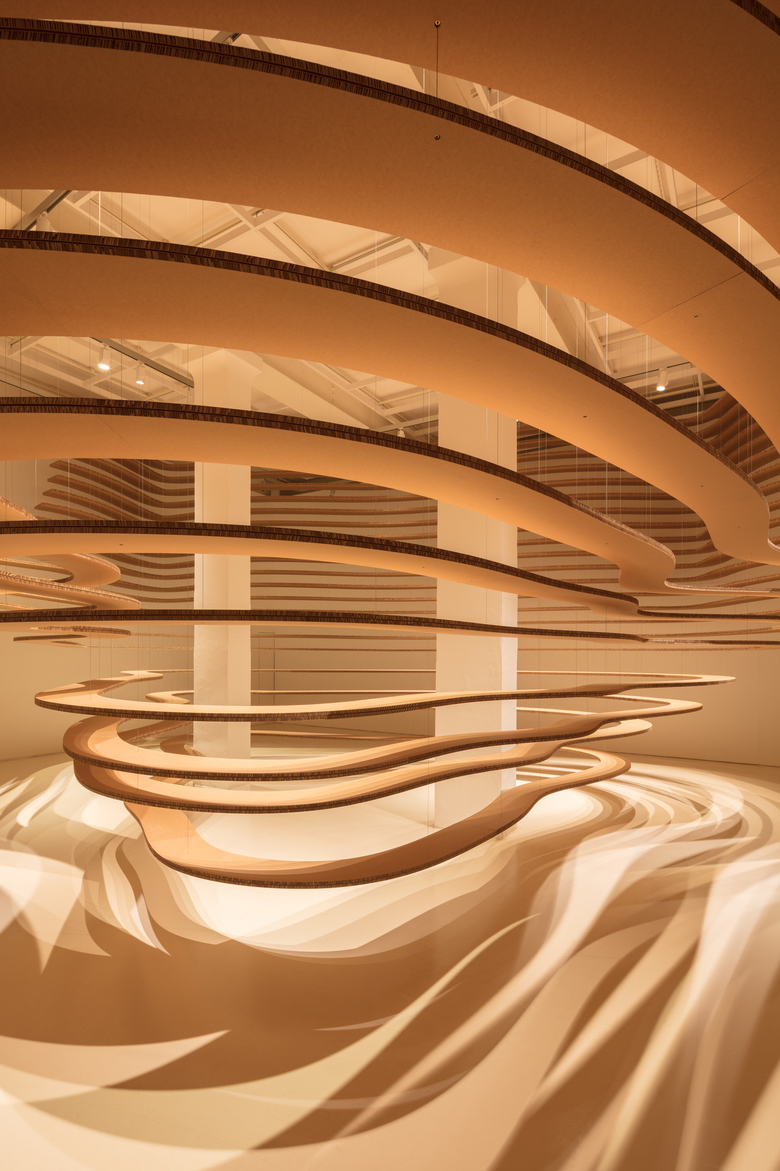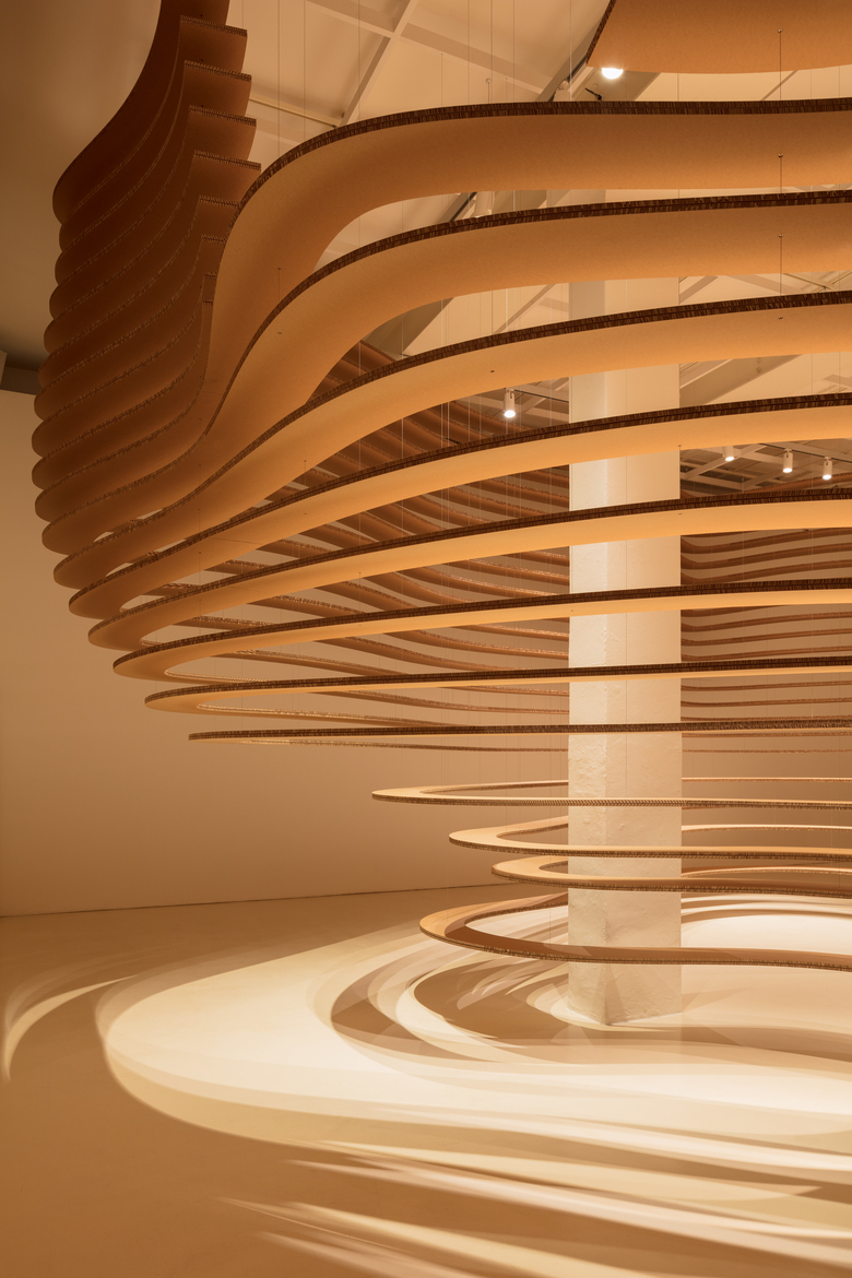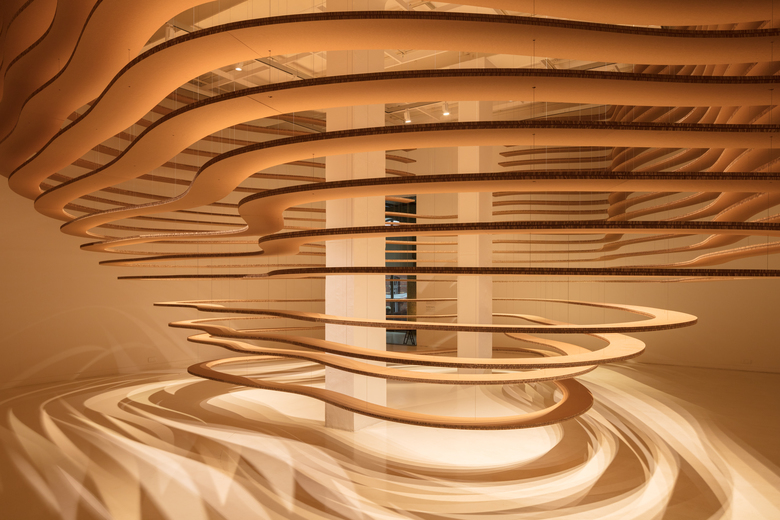 The organic shape of the building complex with its iconic louvres, and the generous planting, contribute to an improvement of the microclimate and increase biodiversity. Inspired by Asian paddy field terraces, the green center formed by the four towers—with its multi-story three-dimensional gardens—reflects the diversity of tropical flora and creates a new habitat. The compact and efficient layout design is complemented by energy-saving ventilation systems, highly effective external solar screening devices, and glazing that reduces solar radiation into the building. A space-filling sculpture is the central exhibit in the Aedes Architectural Forum; it models the deliberate design of the building shape so that it can be fully appreciated. A documentary film of the building by architectural photographer HG Esch, interviews with project participants, and explanatory diagrams of the project provide visitors with new ideas for architecture in mega-cities.