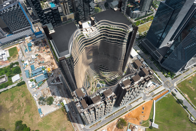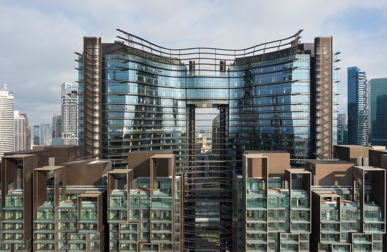 Die organische Form des Gebäudes mit seinen ikonischen Lamellen und die üppige Bepflanzung tragen zu einer Verbesserung des Mikroklimas und Erhöhung der Biodiversität bei. Inspiriert von asiatischen Reisterrassen spiegelt die grüne Mitte im Innern der vier Türme mit seinen mehrstöckigen, dreidimensionalen Gärten die Vielfalt der tropischen Flora wider und schafft einen neuen Lebensraum. Dieses „Green Heart“ umfasst über 350 verschiedene Baum- und Pflanzenarten, darunter 700 Bäume, auf einer Grünfläche von 37.000 Quadratmetern. Verschiedene Tierarten werden Teil dieser biologischen Vielfalt. In konzeptioneller Anlehnung an die natürlichen Klima- und Höhenveränderungen eines Regenwaldes basiert die Landschaftsarchitektur auf dem Schema eines grünen Tals, das je nach Level variiert.