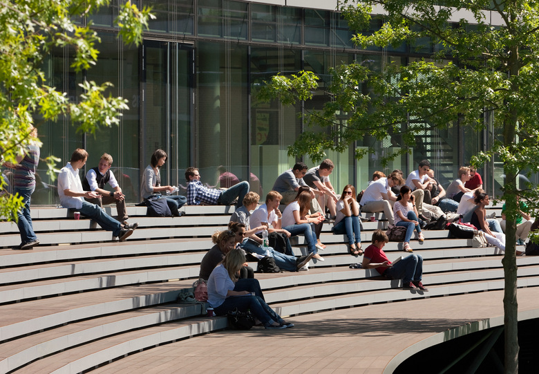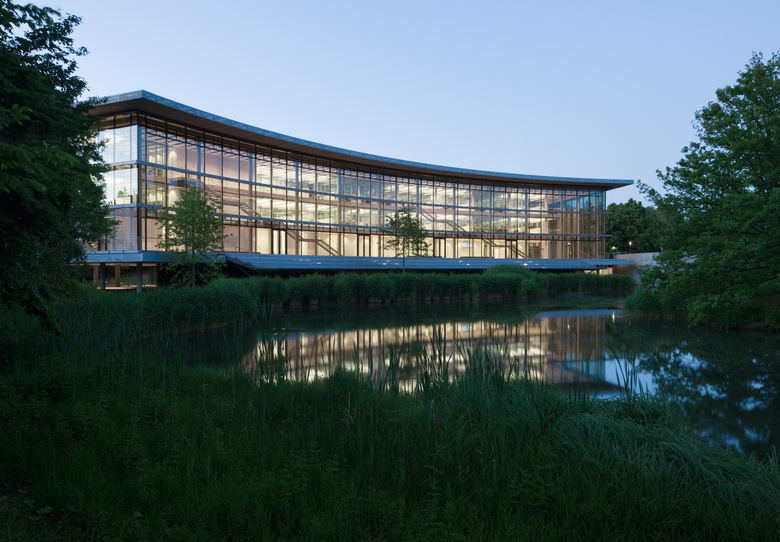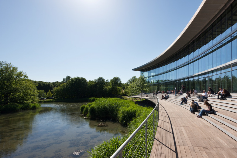 Die sanft gebogene Form folgt dem am Grundstück gelegenen See. Der zuvor unzugängliche See ist jetzt von einer einladenden Holzterrasse flankiert – ideal, um im Freien zu arbeiten und lernen. Die Terrasse hat sich in einen intensiv genutzten Treffpunkt für den gesamte Campus verwandelt.