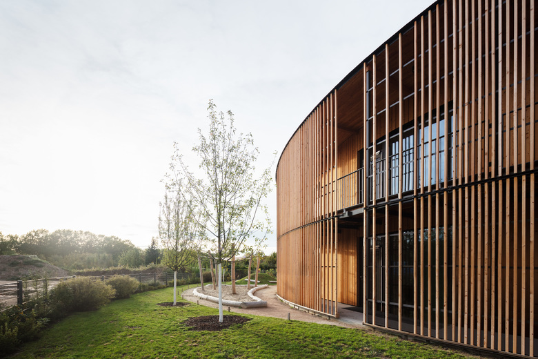 Visuell bestechen beide Gebäude besonders durch ihre Lärchenholzfassaden aus lokalem Waldbestand. Beim Rathaus ist die Fassade aus versetzt angeordneten, senkrecht auskragenden Modulen mit Photovoltaikzellen und hochwertiger Wärmedämmung konstruiert. Die deckenhohen gläsernen Fassadenelemente erlauben eine optimale Tageslichtnutzung. Die Fassade des kreisrunden Baus der Kindertagesstätte wird charakterisiert durch einen umlaufenden Laubengang mit einer offenen feingliedrigen vertikalen Holzstruktur. Unterbrochen wird die äußere Fassade dort, wo direkte Ausblicke, Tageslichteinfall und Gebäudeerschließung ermöglicht werden sollen.