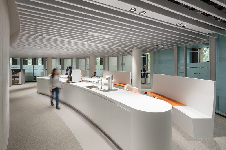 Helle Materialien und Oberflächen unterstreichen den Eindruck von Transparenz und Klarheit, nur punktuell tauchen Farbakzente innerhalb eines orange-roten Spektrums, insbesondere in der Gestaltung der Möbel, auf.