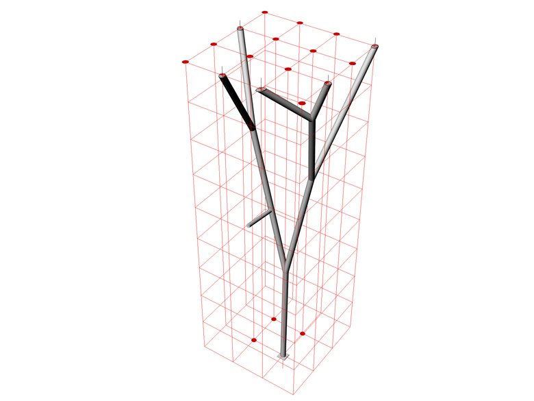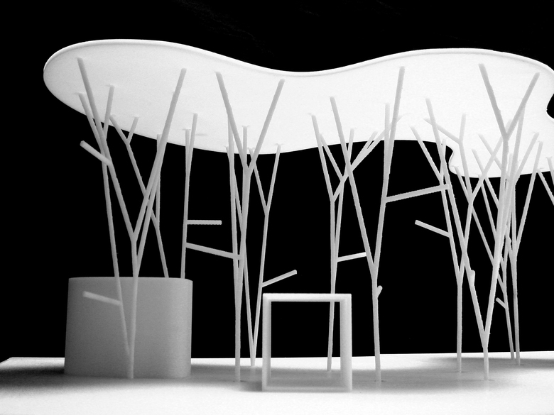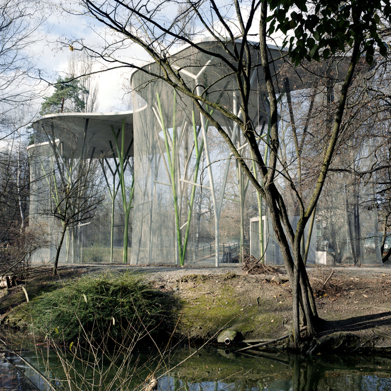 Les structures arborescentes des 2 nouvelles volières du Bois-de-la-Bâtie révèlent à la fois une efficacité structurelle et la poésie en dialogue avec le paysage environnant. D’après les principes structurels développés par Antonio Gaudi et Otto Frei, chacun des seize piliers est unique, créant un équilibre statique précis et fragile, découpé et assemblé en atelier à l'aide de machines à commandes numériques.