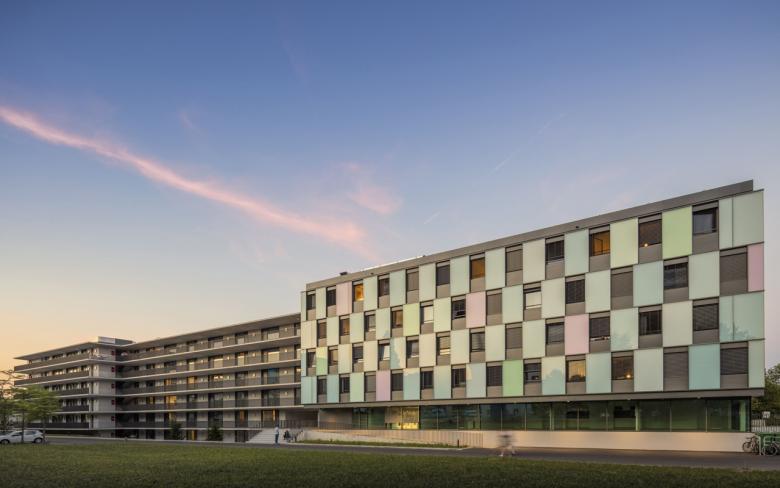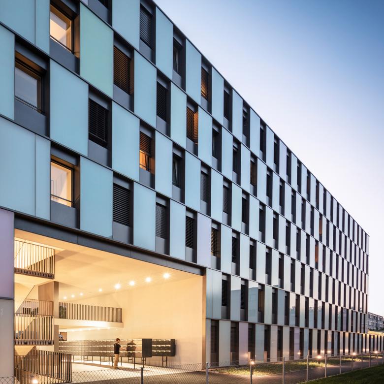 La nouvelle résidence académique, longue de 120m, accueille un programme de logements prévu pour 230 étudiants et résolu avec diverses typologies d’habitation individuelles et collectives et des espaces communs se répartissant sur six niveaux. Pour amoindrir la grande dimension du bâtiment, le projet propose une articulation volumétrique entrecoupée par des retraits et décalages. Les logements s’articulent le long des couloirs intérieurs et des coursives extérieures en porte-à-faux. La structure porteuse est formée en planchers-dalles en béton armé s’appuyant sur les porteurs verticaux.