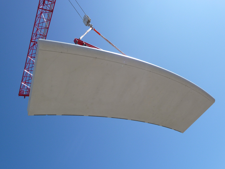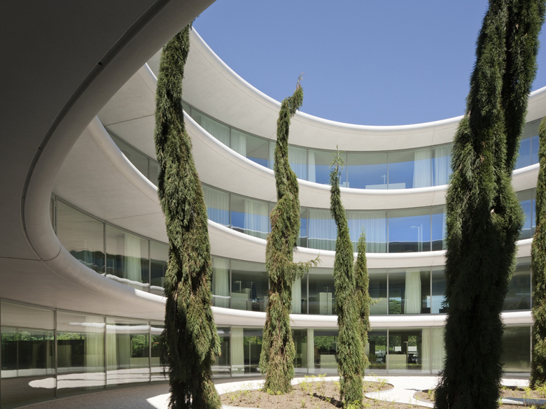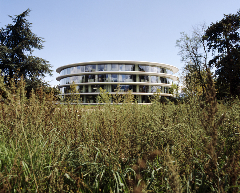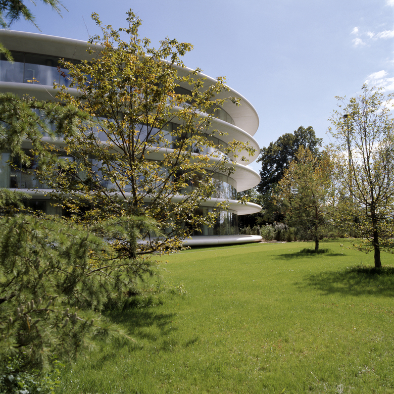 Le nouveau bâtiment administratif de l'Union des Associations Européennes de Football se distingue par sa forme annulaire, ses avant-toits en béton blanc et sa façade vitrée curviligne.