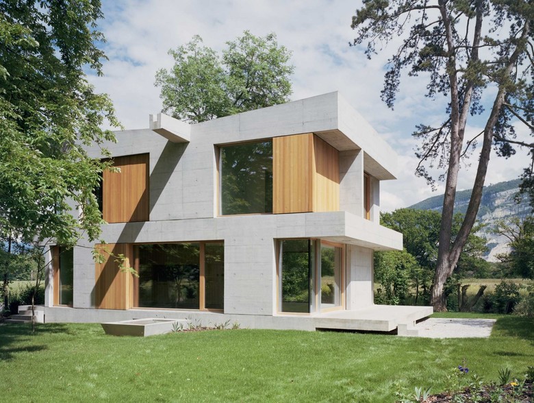Au pied du Salève, la villa SMR se présente sous la forme d'un empilement de trois tables en béton armé. Structurelles, elles façonnent également les différents espaces et ouvertures du projet. Cette petite structure habitable en béton apparent s'installe ainsi de manière discrète et compacte dans le paysage champêtre.