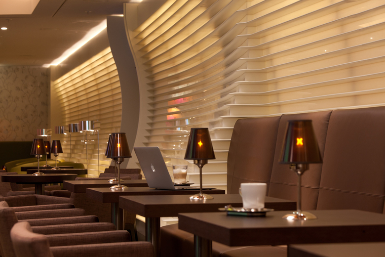 Für Veranstaltungen von bis zu 570 Personen wartet der Ballsaal "The Globe" auf Besucher. Konzipiert als Haus im Haus spielt er in seiner organischen Form auf die Architektur des THE SQUAIRE an, und auch seine silbrige Hülle aus Glasmosaik reflektiert das Licht ähnlich effektvoll wie das Äußere des Gebäudes. Strahlend geht es im Inneren weiter. In die Wände eingelegte Swarovski-Kristalle, die wie Leuchtstreifen durch den Raum zu "blitzen" scheinen, sorgen zusammen mit den wellenförmigen Lichtvouten in der Decke für mehr als beeindruckende Lichteffekte. Natürlich kann der Saal auch für größere (oder geteilt für kleinere) Business-Meetings in Anspruch genommen werden, wobei zusätzlich diverse Konferenzräume auf der Lobby-Ebene zur Verfügung stehen. Auf Gäste der Executive Zimmer wartet in Ebene zehn zudem die mit vielen Features ausgestattete "Executive Lounge". Computer lassen sich hier unsichtbar in den großzügigen Empfangstischen versenken, deren edle, dunkelbraune Oberfläche aus Nussbaum einen idealen Kontrast zu den hellen Lamellen-Fronten bildet – wieder eine kleine Hommage an die dynamische Außenhaut des Gebäudes. Im Gegensatz dazu haben die Lamellen bei den freistehenden Sitznischen aus hellem Leder einen behaglichen "Cocooning-Effekt". An diesem Ort lässt es sich ungestört, abgeschirmt arbeiten. Natürlich können Gäste sich ebenso in eine der gemütlichen Lounge-Bereiche oder in die Bibliothek zurückziehen, wo man in den komfortablen hellen Ledersesseln auch entspannt auf einen verspäteten Flug warten kann. Falls der Flieger doch früher gehen sollte, wartet ein early-bird Frühstück im Buffetbereich - mit ihrem belebenden, leuchtenden Pink vertreibt die Beleuchtung hier etwaige Müdigkeit sofort auf angenehme Art.