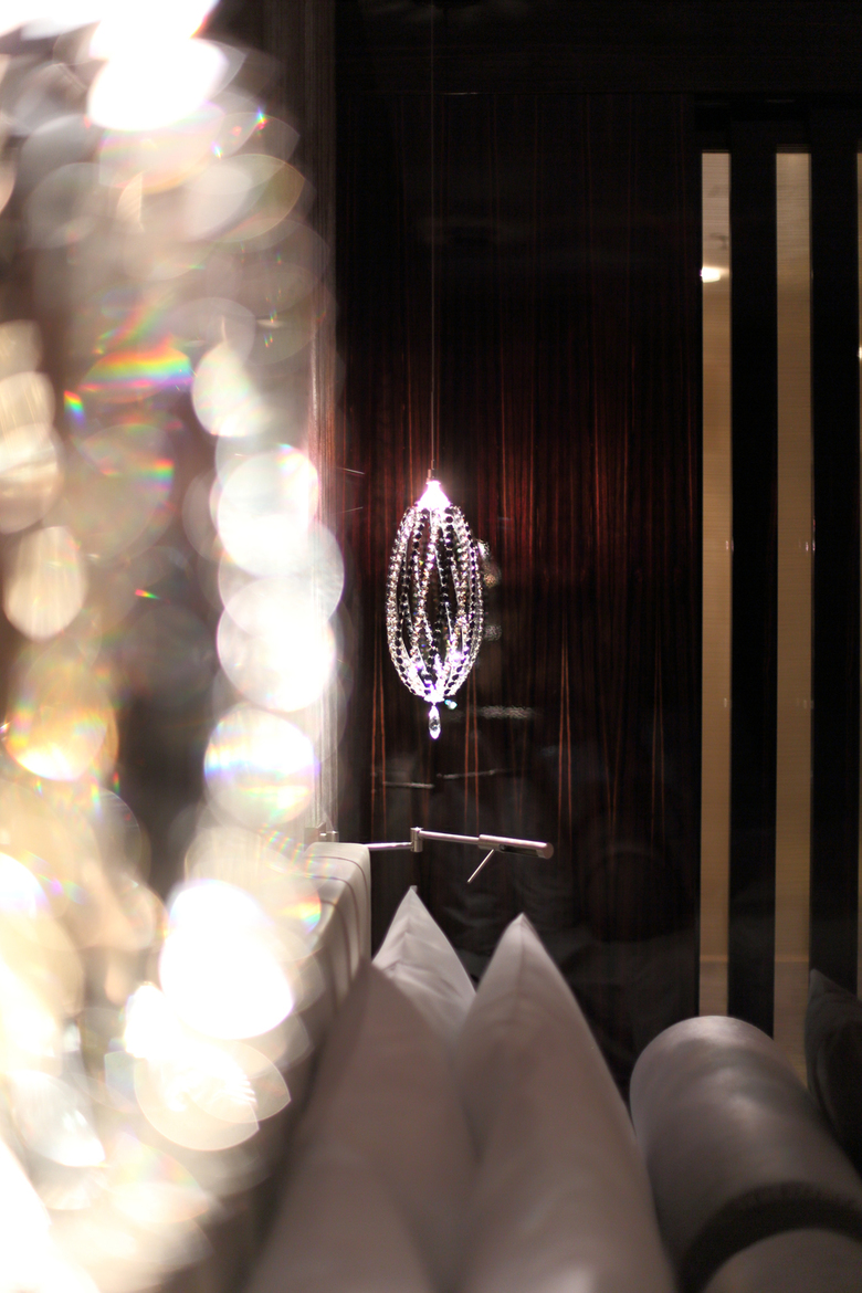 Kleine Symbole dieses Wechselspiels begleiten den Gast auch auf dem Weg zu den Zimmern, wo er beim Durchschreiten der Empfangshalle durch die, schwarzen Streifen in den hellen Fliesen aus hochwertigem Naturstein fließend geleitet wird – leicht abgebremst durch die skulpturalen, großen, seidenbezogenen Stehleuchten, die in ihrer Blütenform für eine wohlig gedämpfte Stimmung sorgen.