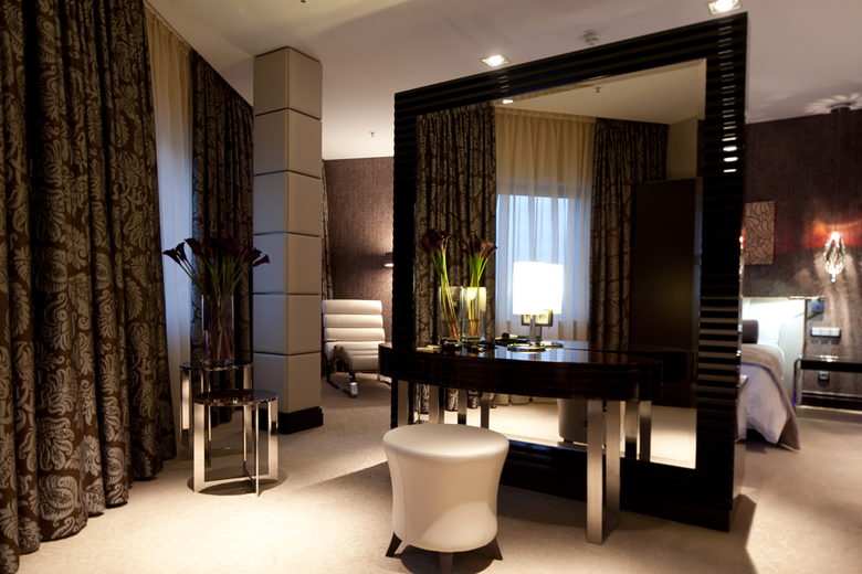 Das Design der Präsidentensuite spiegelt eine für den Standort Frankfurt ideale "sophisticated internationality" wider, die keine Wünsche offen lässt. Der luxuriöse Schlafbereich ist in edlen silber-grau Tönen gehalten. Die kleinen Kronleuchter über den Nachttischen tauchen den Raum in ein gehobenes Licht und werfen schöne Schatten auf die dezent florale Tapete. Das Bad gleicht einer Wellnessoase: die freistehende schwarze Jaccuzzibadewanne wurde extra von einer Künstlerin aus Fliessbelag mit eingefassten Metallstreifen angefertigt und auch der Spiegel mit Perlmuttumrahmung sowie der gold-schwarze Granit unterstützen diese Wertigkeit, die von der Wand im Loungebereich, die mit 18-karätigem Blattgold belegt wurde, sogar noch übertroffen wird.