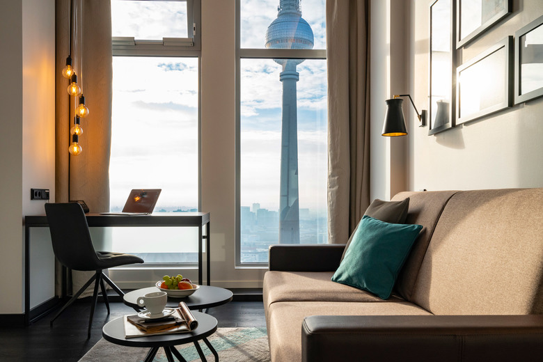 Über den Dächern von Berlin: Die Umnutzung der ehemaligen Eventfläche im 37. Stock im Park Inn in exklusive Suiten mit einem einzigartigen Blick auf die Hauptstadt war die Grundlage für das neue Konzept – ein Spiel aus leichten, hellen Farbtönen in Kombination mit einer filigranen Linienführung bildete die Antwort. Ein Hauch von Bauhausarchitektur lebt auf. Sonst nimmt sich die Innenarchitektur eher zurück, wird mit Respekt vor der beeindruckenden Kulisse nur ‚eingestellt‘ und lässt die Bühne frei für den Hauptdarsteller: Den Blick. Hier ist man der Stadt ganz nah – und doch dem Trubel und dem geschäftigen Treiben so fern.