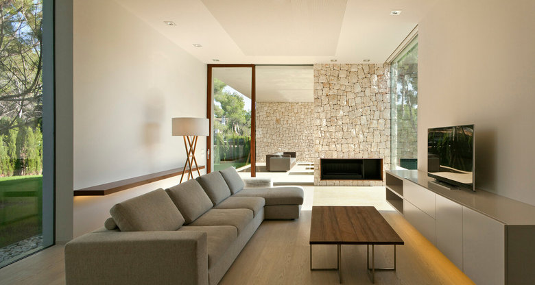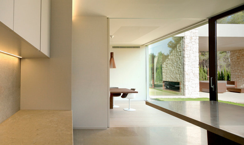 El objetivo del proyecto de Ramon Esteve ha sido la creación de diferentes áreas exteriores vinculadas a las estancias interiores, según el grado de intimidad de cada una de ellas. Cada pieza tiene una altura en función de su uso desarrollándose en una planta, excepto el volumen de los dormitorios. Con este gesto se obtiene una planta en forma de cruz que organiza el espacio exterior. Partiendo de cuatro muros de piedra, se generan unos volúmenes prismáticos que fragmentan el espacio, individualizando cada estancia.