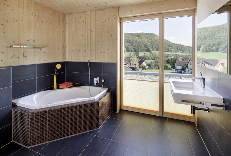 Auch der Wunsch der Bauherren nach einem bestmöglichen Schutz gegen Elektrosmog und Hochfrequenzstrahlung wird durch diese spezielle Holzbauweise erfüllt, so wird sogar die Decke über dem betonierten Kellergeschoss in Holz erstellt.