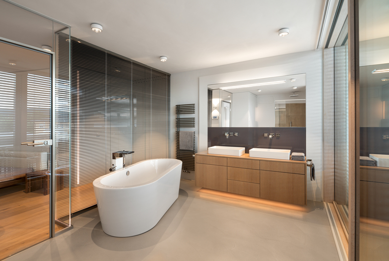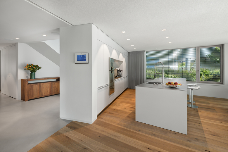 Flurbereich und die Bäder besitzen einen Boden aus geschliffenem Estrich. Die Wohn- und Schlafräume erhalten ein Eichenparkett. Großzügige Einbaumöbel sorgen für einen einheitlichen Charakter der Inneneinrichtung.